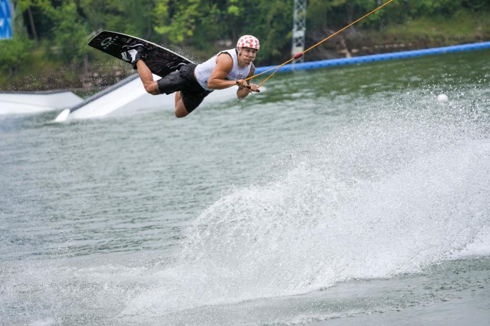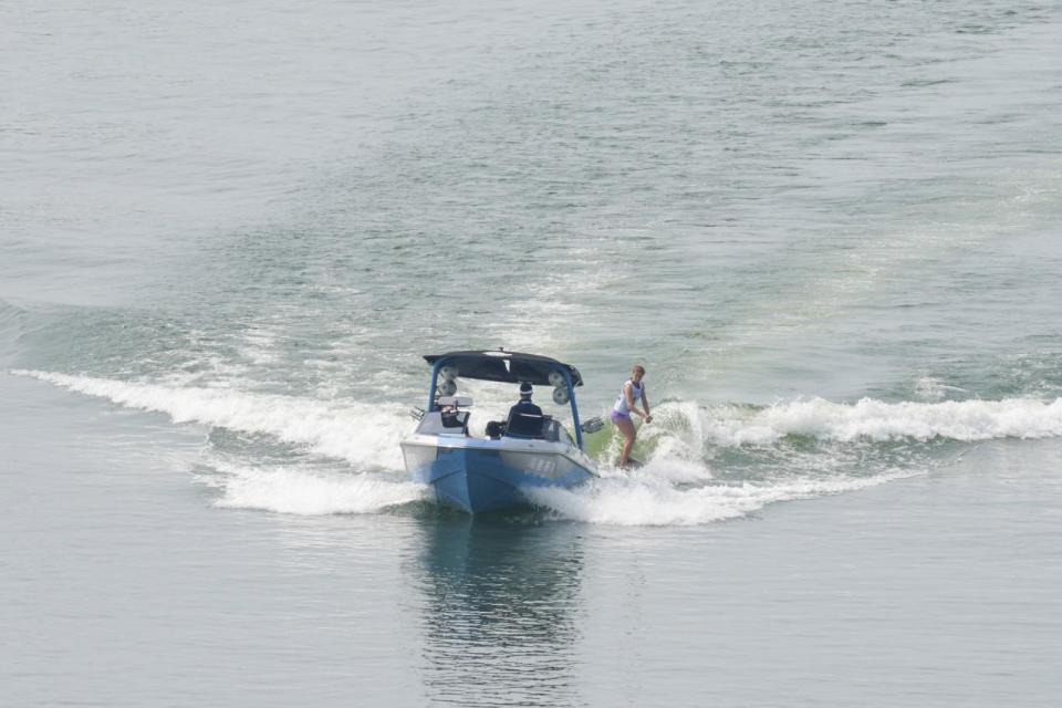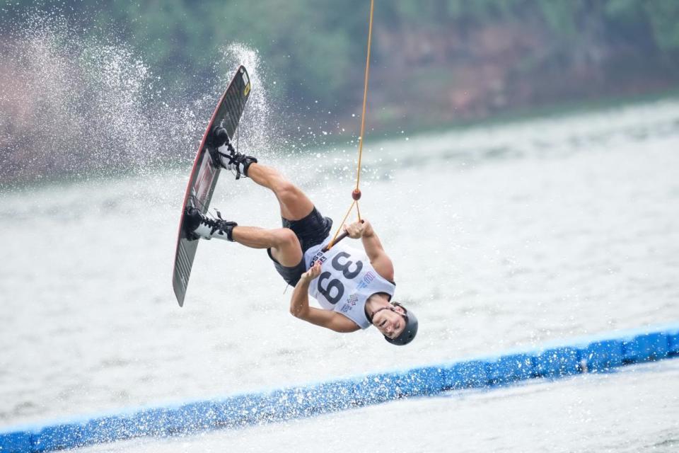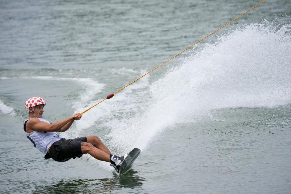 尾波滑水强调力量与技巧的结合,比赛中,运动员借助船尾波浪,在水域中完成空中翻转、抓板等高难度动作。